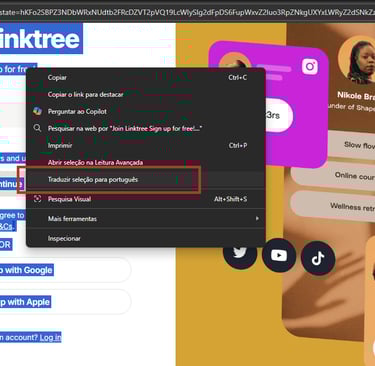 Você pode selecionar o texto ou não, depois clicar com o botão direito do mouse em cima da página, feito isso vai abrir uma janela flutuante, e você vai clicar em “traduzir seleção” ou só “traduzir”. Pronto ele vai traduzir a página toda.