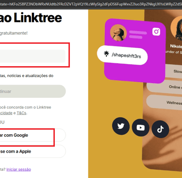 Bem, para se cadastrar no site do Linktree, se você não é cadastrado, segue o mesmo passo a passo padrão de sempre para cadastros. Assim como você fez para cadastrar no Google para ter seu e-mail, como fez para cadastrar no Bitly, etc; vai fazer praticamente a mesma coisa.
