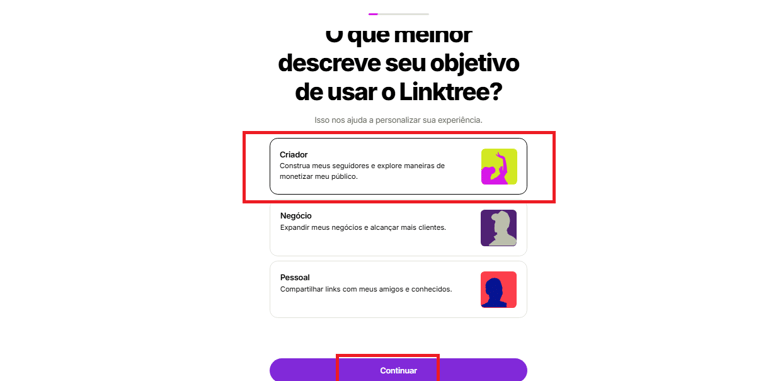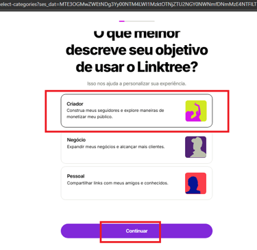 Se for de “criador”, se é “de negócio” ou se é “pessoal”. Coloque criador. Clique em “continuar”.
