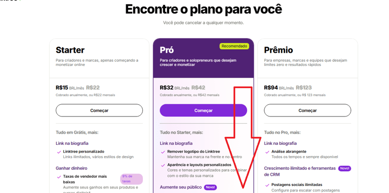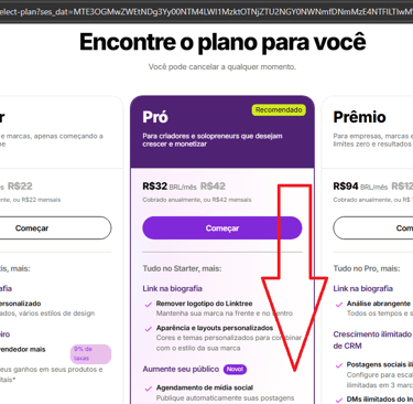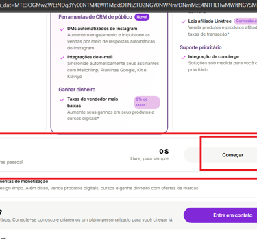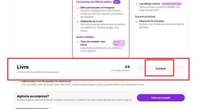 Vai escolher um plano. O plano free é lá embaixo, role a tela.