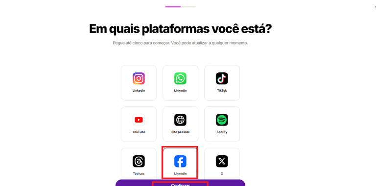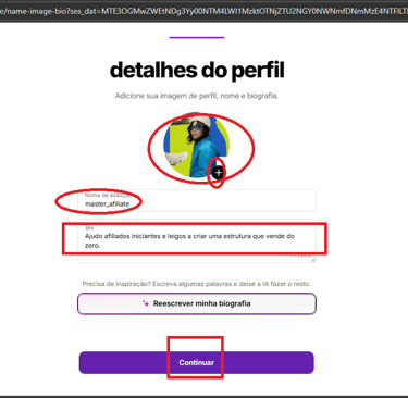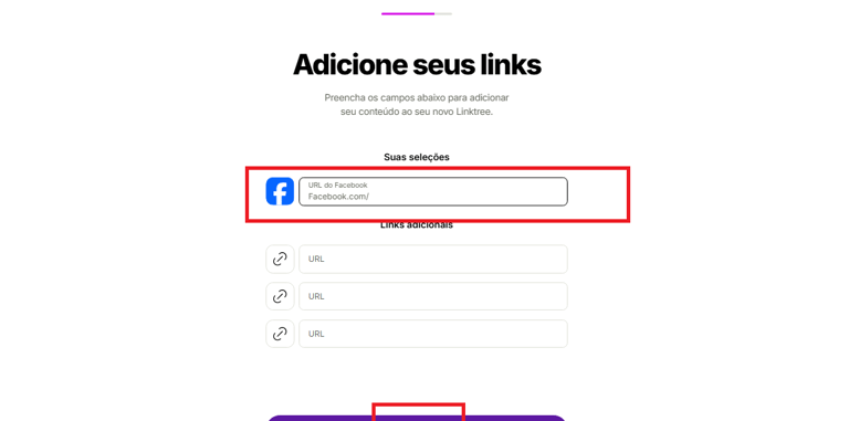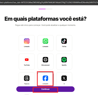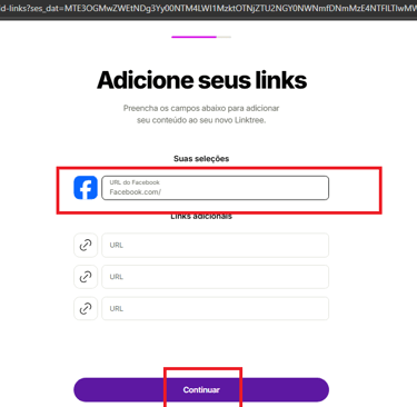 Adicione o link de uma página ou perfil se tiver um dos dois, e clique em “continuar”; se não tiver clique em “continuar” e prossiga com o processo.