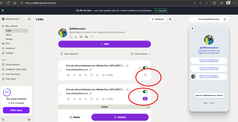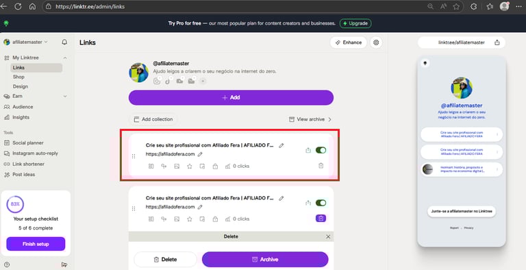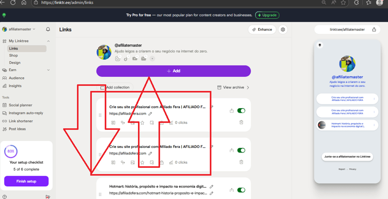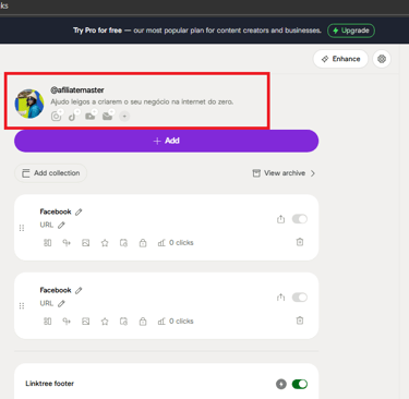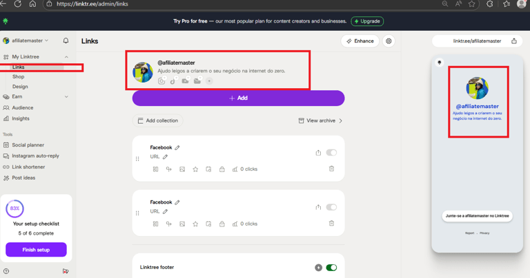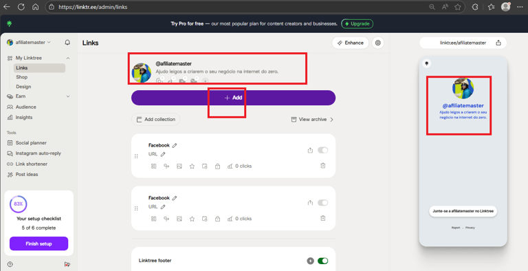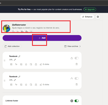 Pronto agora você está “dentro” do seu Linktree, ou sua árvore (lista) de links.