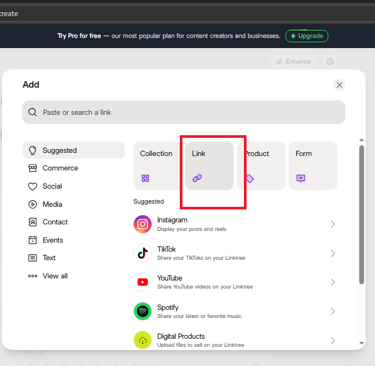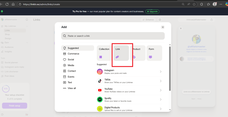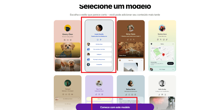 Pronto aqui você tem várias opções para criar o seu link ativo. Como pode ver essa aba é a aba de sugestões. Logo, você pode navegar pelas abas clicando nelas e escolher outros tipos de links, como “de contato, de redes sociais, de canais”, etc. Isso fica a sua escolha e estratégia. Você define. Se quiser colocar o link de um Perfil do Instagram selecione redes sociais e Instagram ícone.