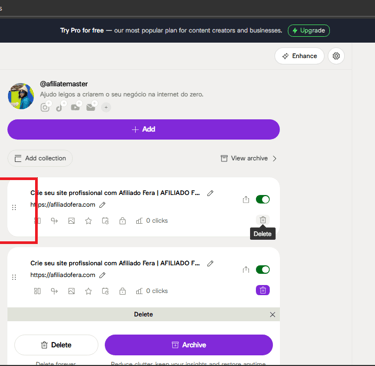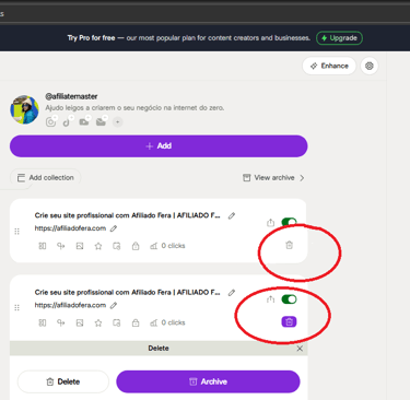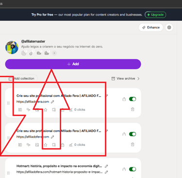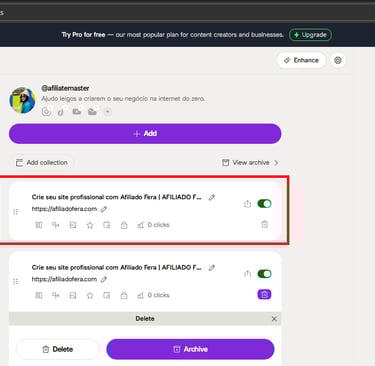 E também já pegou (ou copiou) os seus links do produto que você promove (lá na plataforma de afiliado), e já colou eles num arquivo do bloco de notas, salvou, para depois usar (colar) eles aqui na Linktree.