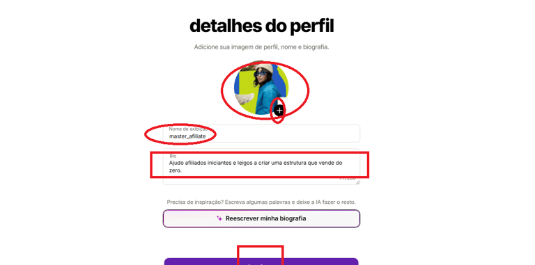 Aqui você clica no + da bola, para Upar uma imagem de perfil, coloca um nome de exibição, que vai ficar aparecendo junto do link da Linktree, que é o nome do seu negócio, ou perfil; e abaixo defina a sua Biografia, do que se trata o seu negócio, ou o que ele resolve.