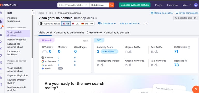 Com o SEMrush você consegue analisar concorrentes diretos como outros afiliados ou produtores.